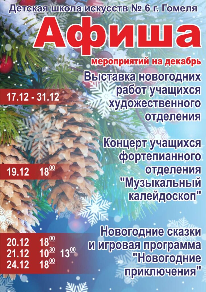 Автор записи:DSHI6 Запись опубликована:09.12.2024 Рубрика записи:Новости Комментарии к записи:0 комментариев Вам также может понравиться Городской конкурс “Авоська” 20.02.2025 ✅Церемония награждения работников сферы культуры по итогам 2024 года в рамках заседания коллегии главного управления культуры Гомельского облисполкома. 27.03.2025 Афиша новогоднего концерта 11.12.2023 Добавить комментарий Отменить ответКомментарийВведите свое имя или имя пользователя, чтобы прокомментировать Введите свой email-адрес, чтобы прокомментировать Введите URL вашего веб-сайта (необязательно) Сохранить моё имя, email и адрес сайта в этом браузере для последующих моих комментариев.