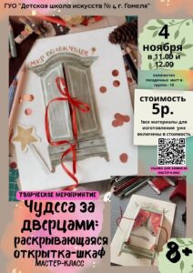 Афиша творческих мероприятий на осенних каникулах Автор записи:DSHI4 Запись опубликована:23.10.2025 Рубрика записи:Новости Комментарии к записи:0 комментариев Вам также может понравиться Гала – концерт Гомельской области «Беларусь– моя песня», Дворец Республики🇧🇾 30.04.2024 Открытие выставки художественных работ «Зимняя сказка» в Русском доме в Гомеле 19.12.2025 Состоялся отчетный концерт духовых и ударных инструментов🎷🥁 06.03.2025 Добавить комментарий Отменить ответКомментарийВведите свое имя или имя пользователя, чтобы прокомментировать Введите свой email-адрес, чтобы прокомментировать Введите URL вашего веб-сайта (необязательно) Сохранить моё имя, email и адрес сайта в этом браузере для последующих моих комментариев.
